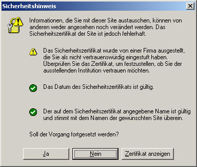 Nach der Bestätigung mit 'OK' kommt ein weitere Sicherheitshinweis. Es wird hier angezeigt, ob das Zertifikat von einer vertrauenswürdigen Firma ausgestellt wurde, ob das Datum des Zertifikat noch gültig ist und ob der Name der Site mit dem auf dem Sicherheitszertifikat angegebenen Namen übereinstimmt. Mit dem Button 'Zertifikat anzeigen'