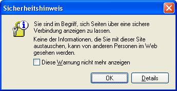 erfolgen. Test der SSL-VerbindungEin erster Test der SSL-Verbindung kann mit einen Browser (in diesem Bsp. z.B. mit dem Internet-Explorer) stattfinden. Nach Eingabe der URL: 'https://ssl-test.tld' sollte nun ein Sicherheitshinweis kommen das nun über eine sichere Verbindung die Seiten angezeigt werden: