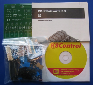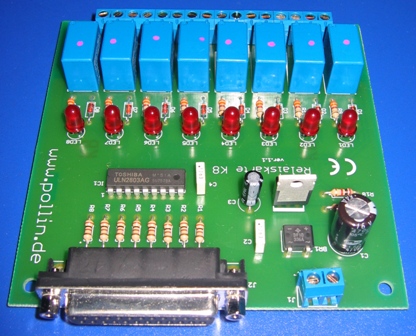 Mittels einer Relaiskarte können z.B. Verbraucher (Lampen, Motoren, etc.) vom PC aus geschaltet werden. Im Folgenden wird vorgestellt wie eine solche Relaiskarte unter Linux betrieben und genutzt werden kann. Dabei kommt exemplarisch eine acht-Kanal-Relaiskarte, angeschlossen am Parallelport des PCs, zum Einsatz. Anschaltung einer parallelen RelaiskarteIm Internet wird eine Vielzahl von unterschiedlichen Relaiskarten angeboten. Die meisten dieser Karten werden an die parallelen Schnittstelle (Drucker-Schnittstelle) angeschlossen. Im einfachsten Fall, werden bei diesen Karten die acht Datenleitungen für den parallelen Drucker verstärkt, um so bis zu acht unabhängige Relais anzusteuern. An den Ausgängen der Relais können dann größere Lasten geschaltet werden. Eine preiswerter Bausatz (ca. 10,- Euro), einer solchen Karte kann, z.B. von der Firma: 'Pollin Electronic' bezogen werden. Die folgenden Bilder zeigen den Bausatz und die anschließend fertig bestückte Relaiskarte: