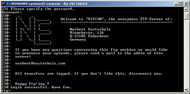 Die Installation und Nutzung kann jeweils auf der entsprechenden Homepage (siehe unten) nachgelesen werden. FTP-Clients (Windows)Auch unter Windows gibt es eine Vielzahl von FTP-Clients. Im folgenden wird auf dem, von Haus aus vorhandenen, FTP-Client aus der 'CMD'-Box von Windows eingegangen, danach werden einige grafisch orientierte FTP-Client unter Windows vorgestellt. FTP ('CMD'-Box)Bei Windows (NT-Systeme) kann der zum System gehörende FTP-Client: 'ftp.exe'