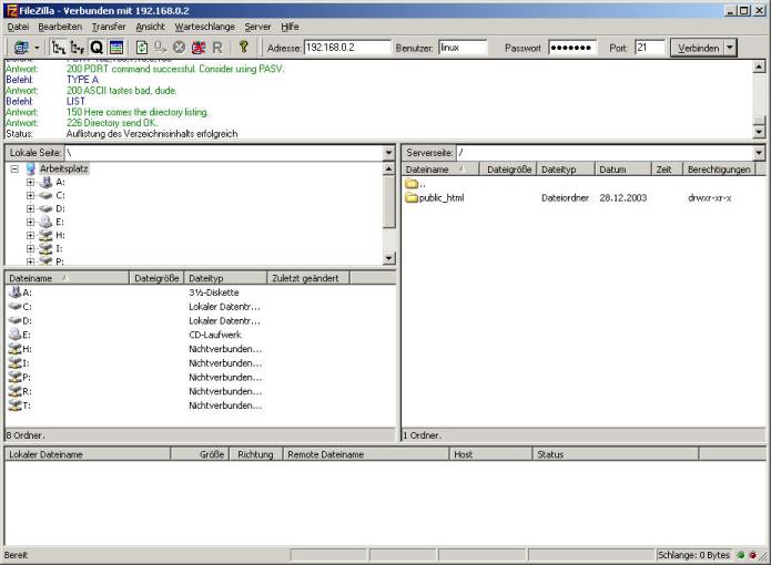 wie beim Script-Mode beim FTP-Client unter Linux. Durch Eingabe von 'help' oder '?' können die möglichen Kommandos angezeigt werden. Mit 'exit' kann die FTP-Sitzung beendet werden. GUI-Windows-FTPAls grafischer FTP-Client unter Windows macht das freie Produkt: 'FileZilla' einen guten Eindruck. Es handelt sich hierbei um einen leistungsfähigen, übersichtlich zu bedienenden Client, mit vielen Features. Hier ein Screenshoot einer FTP-Sitzung mit 'FileZilla': Weitere erwähnenswerte FTP-Clients unter Windows sind z.B.: 'WS-FTP' oder 'SmartFTP', die Links zu den Produkten sind unten zu finden. AnmerkungenAuch mit einen Browser, z.B. den 'Internet-Explorer' unter Windows oder 'Konqueror' unter KDE, ist ein Zugriff auf einen FTP-Server möglich. Bei einen Zugriff auf einen anonymen FTP-Server ist dazu einfach als Adresse der Name oder die IP-Adresse des Servers anzugeben. Damit die Browser weiß, das es sich um einen FTP-Zugang handelt, kann anstatt 'http://' einfach 'ftp://' vorangestellt werden. Das folgende Bild zeigt einen anonymen FTP-Zugang mittels Internet-Explorer: Auch kann man sich mit einen Browser mit einen 'restricted'-FTP–Server (als Benutzer) verbinden. Dazu ist folgender Aufruf einzugeben: